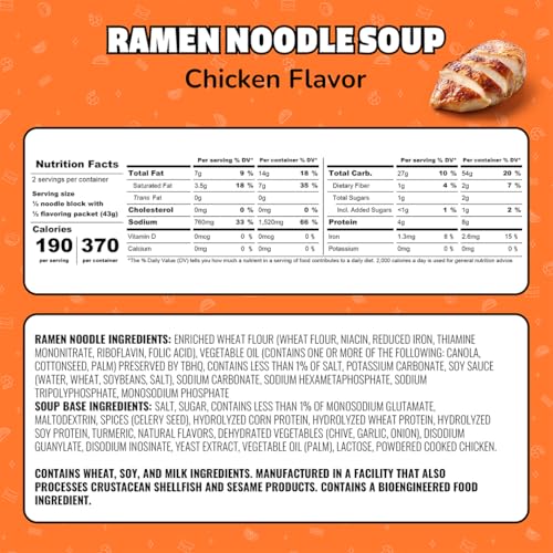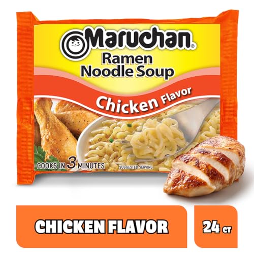About this item COOKS IN 3 MINUTES: Cooking Directions: 1.) Boil 2 cups of water in a saucepan, add noodles and cook for 3 minutes stirring occasionally. 2.) Turn off heat, add contents of seasoning packet, stir well for 1 minute until seasoning is fully dissolved. Makes 2, 8 oz. servings. 3.) Product is very hot. Allow to cook, serve and enjoy. PACKED WITH FLAVOR: Chicken flavor. Not your ordinary chicken noodle soup. Enjoy ramen perfectly seasoned with the savory taste of chicken. FAMILY FAVORITE: Maruchan ramen is one of the nation’s favorite ramen soup brands. Maruchan offers a wide variety of delicious Ramen flavors including less sodium Ramen and authentic ethnic flavor products. Maruchan Ramen makes a creative addition to any recipe. The possibilities are endless. GREAT COLLEGE GIFT: Ramen is a staple snack for college kids so help feed their late-night study cravings with Maruchan ramen! Send a snack care package to your college student. SIZE: 24 pack/count of 3 oz units.
