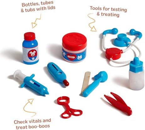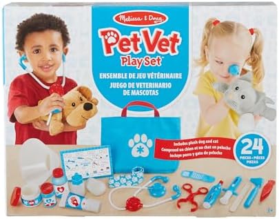Imaginative Pet Doctor Play: Kids can give their plush toys checkups & pretend play treatments, then complete wellness checklists, encouraging creativity and compassionate role-playing every day 24-Piece Vet Kit: Includes dog & cat stuffed animals, along with a stethoscope, thermometer, syringe, ear scope, tweezers, bottles & reusable checklist, all stored in a portable tote for easy cleanup Open-Ended, Screen-Free Play: Builds empathy, communication & problem-solving through preschool learning activities that encourage creativity, confidence & social interaction through pretend play Educational Toys for Any Occasion: When buying a birthday gift & holiday gifts for kids, or rewarding little milestones, celebrate the moments that matter with Melissa and Doug toys for boys & girls Wholesome Play for 35+ Years: Melissa & Doug inspires kid-powered play with its learning toys for kids, baby & toddler toys, puzzles, games, building toys & stuffed animals, dolls, & even a doll house.