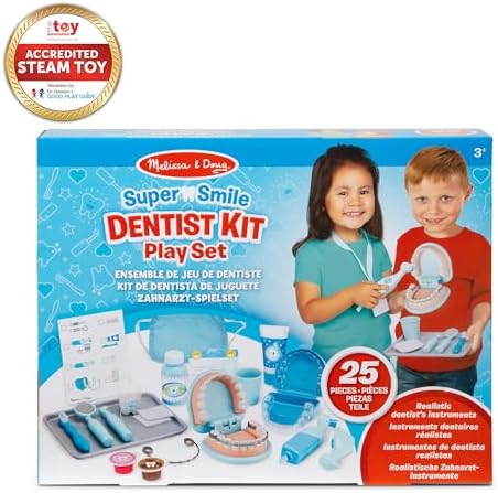 The Melissa & Doug Super Smile Dentist Kit is a 25-piece play set packed with everything kids need to explore the world of dentistry pretend play. Featuring an oversized set of teeth with four removable molars, these preschool classroom must haves let children practice cleaning, treating cavities with stickers, and even fitting retainers and braces, with instruments in a realistic toddler doctor play set that includes a vibrating tool with interchangeable drill and polisher heads, a toothbrush, toothpaste, floss, dental rinse, gauze pads, and more, for a true-to-life play experience. For more thrilling role play, combine this with the Melissa and Doug ice cream set, a toy vending machine & a kids kitchen playset to create the ultimate pretend play world! For 35+ years, Melissa and Doug has crafted imaginative preschool toys and durable wooden toys built to nurture childhood wonder, with everything from a life-sized grocery store playset to a play kitchen playset and play food to serve plush toys & puppets, to costumes, arts & crafts, and road trip activities for kids. It’s the kind of kid-powered play that builds independence and confidence!