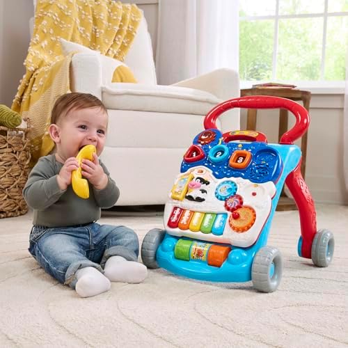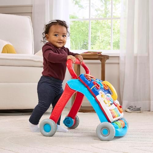 From baby steps to big steps, the Sit-to-Stand Learning Walker by VTech helps your baby develop from a crawler to a walker through adaptive technology. With a barnyard of playful friends to cheer them on, your little one will have endless fun as they learn to walk and learn first words. Start out with the easy-to-remove activity panel for floor play or on-the-run fun, then step it up with the fun-to-maneuver walker and baby standing activity center. Spinning gears, five piano keys, three colorful rollers, three light-up shape sorters, three light-up buttons and a telephone handset offer endless fun that will stimulate your baby’s learning and strengthen little hands and fingers. The baby activity center keeps baby on track by teaching shapes, colors, animals, music and more! Requires 2 AA batteries (included, but new batteries recommended for regular use). Intended for babies and toddlers from 9 months to 3 years old.